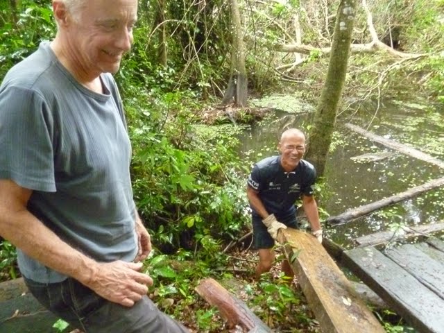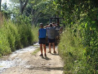 Au retour, los Pedros regardent un ouvrier qui améliore notre route quotidienne.