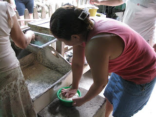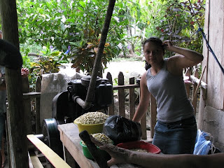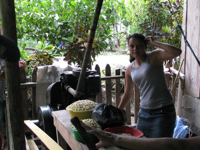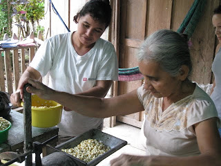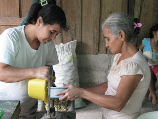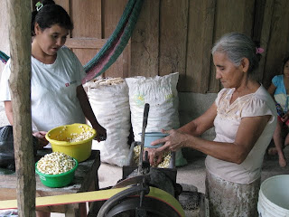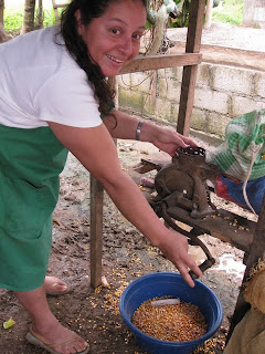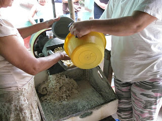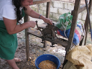 Les fameuses tortillas qui nourrissent une grande partie de la population mondiale. Nous avons eu la chance d'assister à une opération importante dans le processus de leur confection: le fabrication de la masa, la pâte qui permettra de nourrir, 3 fois par jour, la grande majorité de la population que nous côtoyons. La recette est assez simple: un plat de maïs, un peu d'eau, on fait moudre le tout avec le petit moulin alimenté au diésel (un moulin par village). Voilà, la pâte est prête pour confectionner les petites tortillas, opération exclusivement féminine, et elles sont cuites à chaque repas. Dire que dans les pays riches le maïs est maintenant utilisé pour produire du carburant. Il n'y a pas si longtemps, pour 1 quetzal, on pouvait acheter 5 tortillas prêtes à manger alors qu'aujourd'hui, on n'en obtient que 3...