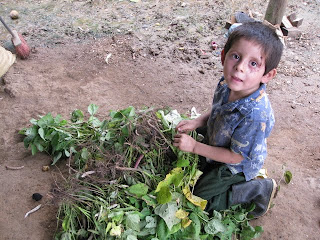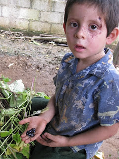 L’almentation est évidemment restreinte aux tortillas et aux frijoles (haricots noirs) Isaï, un peu égratigné par une chute récente, nous en montre quelques grains. La famille est équipée d’une « granadora », petite machine qui égraine les épis de maïs bien séchés. On en voit quelques gros sacs dans la cuisine. Reina me dit qu’environ une fois par mois, il peut y avoir du poulet au menu, nourriture de luxe pour eux.