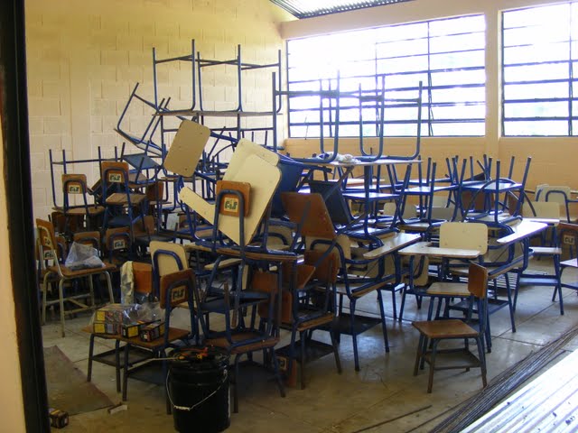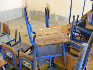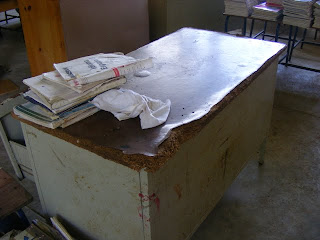 Le vieux toit enlevé permet de ventiler un peu les classes poussièreuses et les pupitres défraichis....