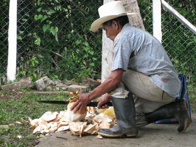 Les échanges Nord-Sud, c'est aussi un peu cela: le Président du Cocode a vite compris qu'en préparant des cocos pour notre groupe, il augmentait nettement ses chances de recevoir des pains aux bananes de Pauline.